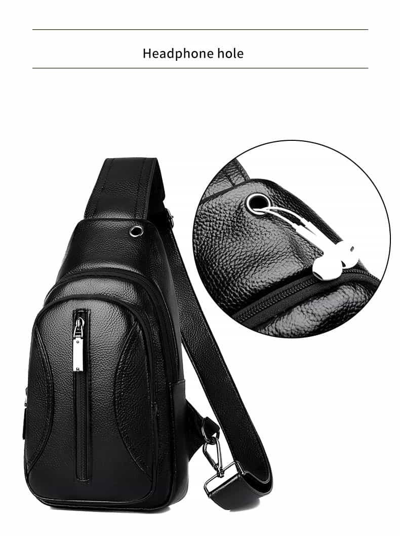 The Men’s Large Capacity Travel Leather Chest Bag is designed for modern men who value both style and functionality. Crafted from premium PU leather, it combines the sleek look of genuine leather with the benefits of being lightweight, durable, and easy to maintain. Featuring multiple compartments, this chest bag keeps essentials such as your phone, wallet, keys, and power bank neatly organized, while the built-in headphone jack design ensures seamless connectivity on the go. Available in classic Black, bold Red, stylish Yellow, and sophisticated Coffee, it offers versatile options to match different personal styles. The adjustable strap provides all-day comfort, and customizable logo options—including heat transfer, laser engraving, embroidery, metal, or rubber—make it suitable for both individual buyers and brand promotions. With its thoughtful design, lightweight build, and professional finish, this leather chest bag delivers the perfect balance of practicality, fashion, and reliability.