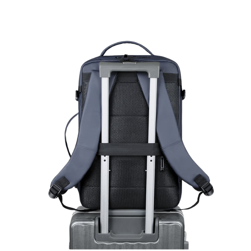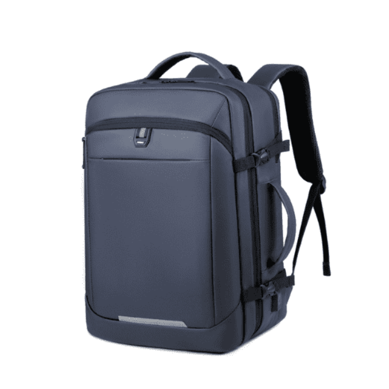 The men’s leather laptop backpack combines a professional PU leather exterior with a slim yet spacious profile (30 cm L × 46 cm H × 17 cm W, 0.9 kg), available in Black, Grey, and Blue.